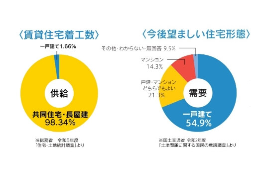 現在、若い世代では「一生賃貸派」が増えています。また賃貸市場では「戸建に住みたい」というニーズに対して、戸建の賃貸住宅は少なく希少性が高いため、供給さえすれば入居者は決まりやすい状況です。